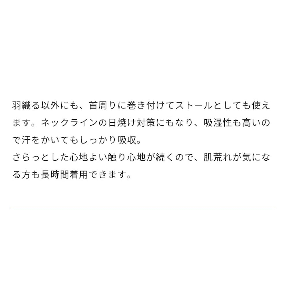 シャツやブラウスと合わせて、日差しが気になる時のUV対策、肌寒い時の上着、巻き付けることでストールにもお使いいただける万能アイテム。オールシーズンお使いいただけます。